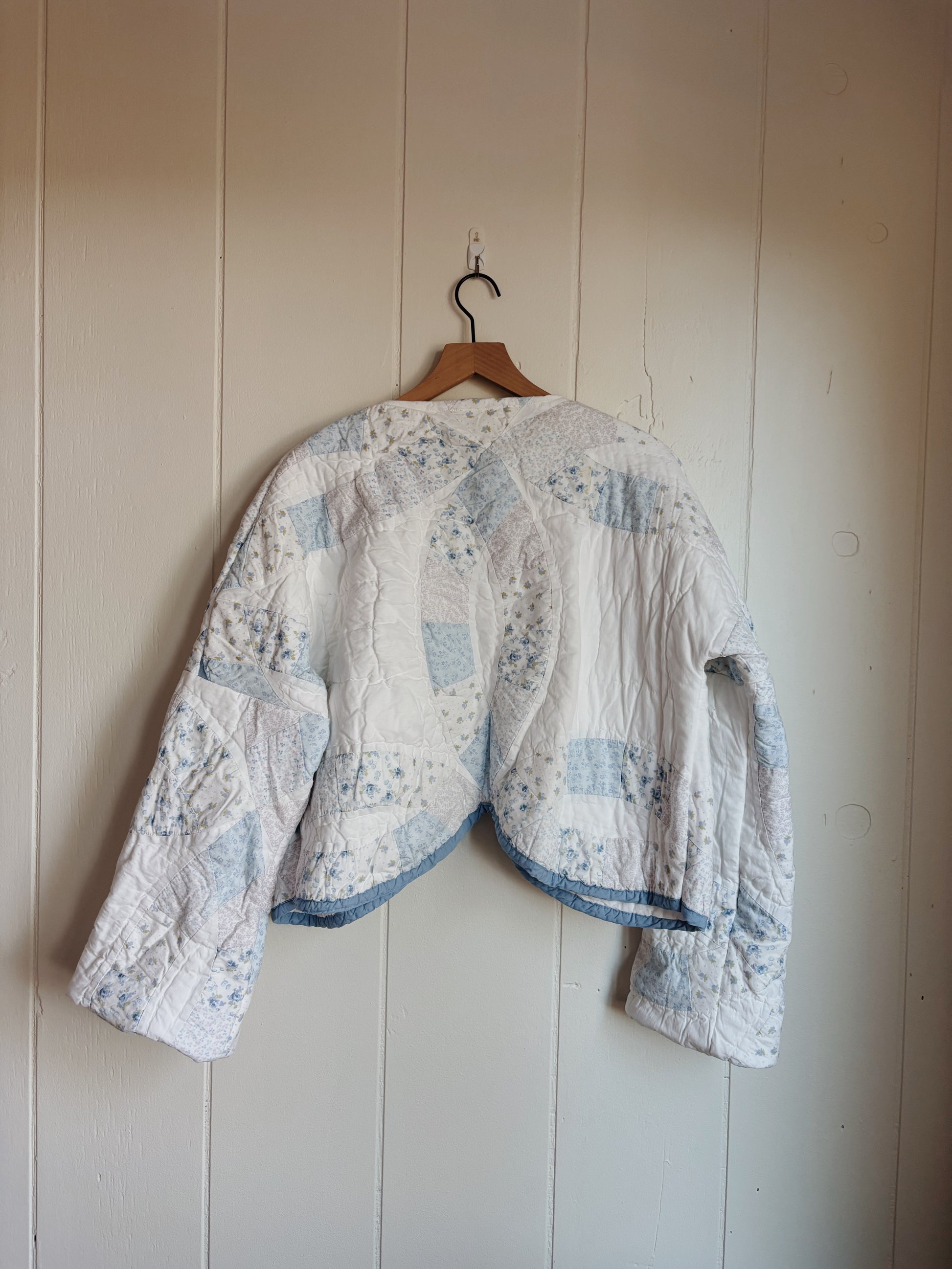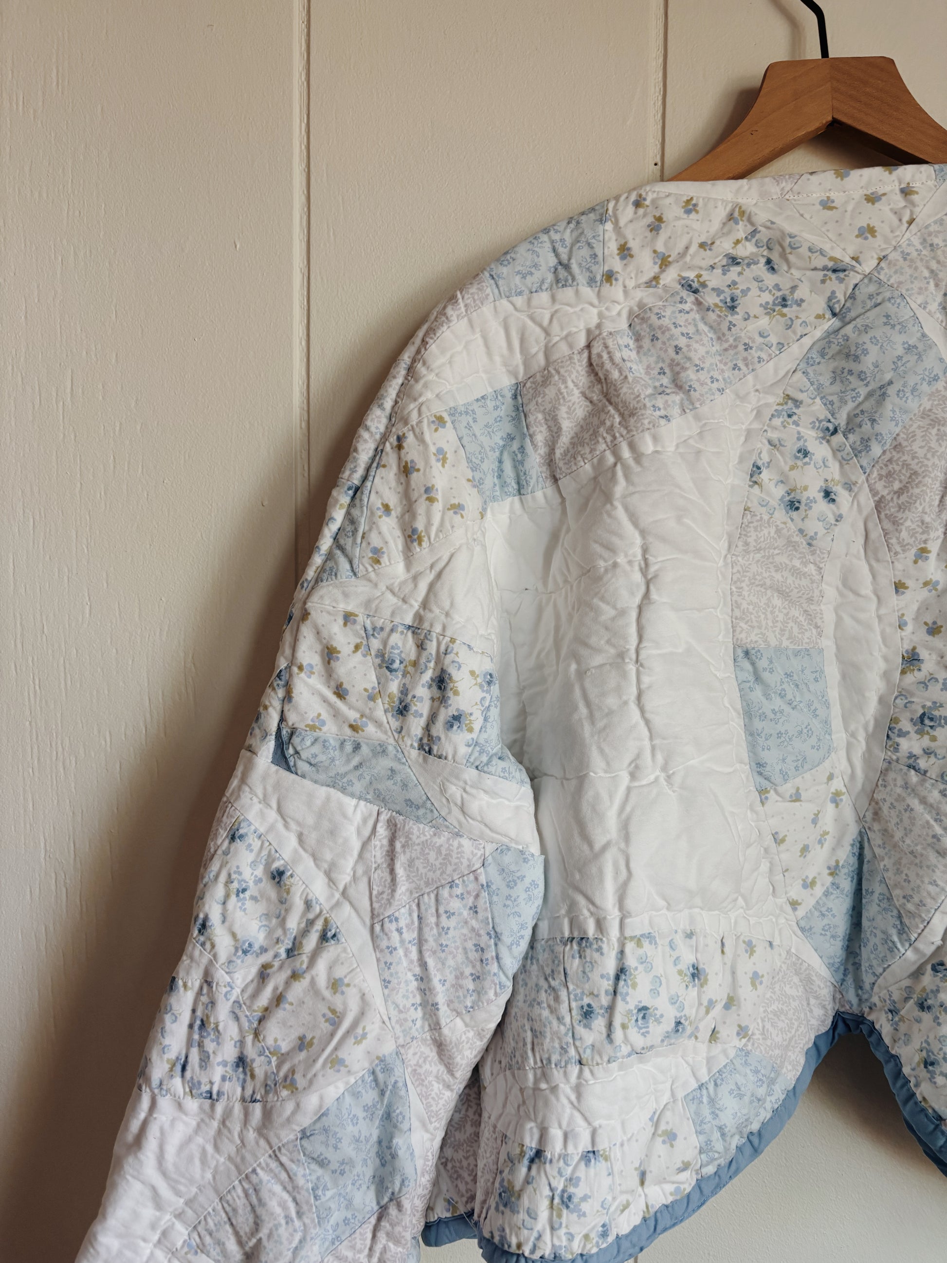 light blue wedding ring quilt coat from vintage quilt